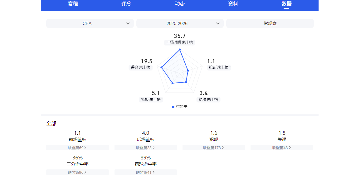 其次,让贺希宁顶替张宁。因为两人身高相同,体型相似,打法接近,得分位置也都很全面,能覆盖外线、中距离、篮下,关键他俩都有大心脏属性。最关键的一点,贺希宁的数据具有说服力——出战18场的他场均能贡献19.5分4.9篮板3.5助攻,这一表现明显优于张宁的场均8.8分3.2篮板3.2助攻。